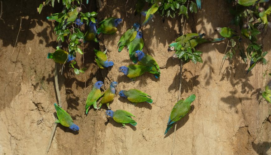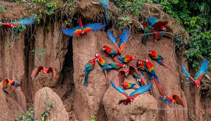A clay lick is a naturally formed wall of mineral-rich clay along a riverbank, created through continuous river erosion. These sites are vital gathering places for many Amazonian bird species. The first parrots usually arrive in pairs, calling to one another as they land on nearby trees. They perch on the highest branches, patiently waiting for the rest of the flock while ensuring the area is free of predators. Gradually, more birds arrive and the surrounding trees fill with movement and sound. After a while, they begin to circle slowly in front of the clay wall or descend toward lower vegetation. Once they feel safe, they gather in groups to consume the clay.